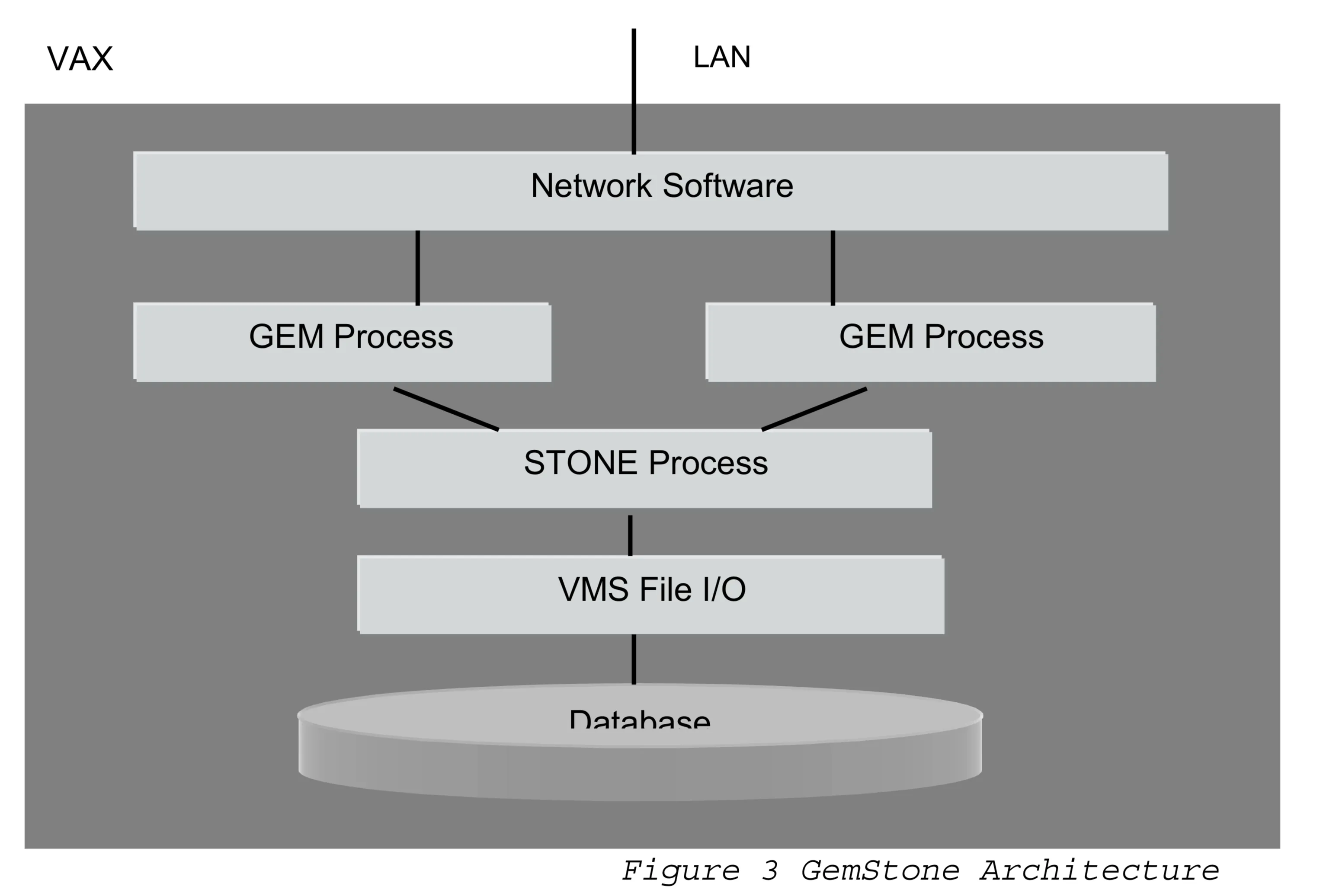 GEM Processinstances exist. GEM Processinteracts withNetwork Software.Network Softwarecommunicates with theSTONE Process.STONE ProcesshandlesVMS File I/O(specific to the VAX VMS operating system shown).VMS File I/Ointeracts with the physicalDatabaseon storage.- Illustrates the separation of concerns between Gem (application/user interface logic) and Stone (storage/database engine logic).