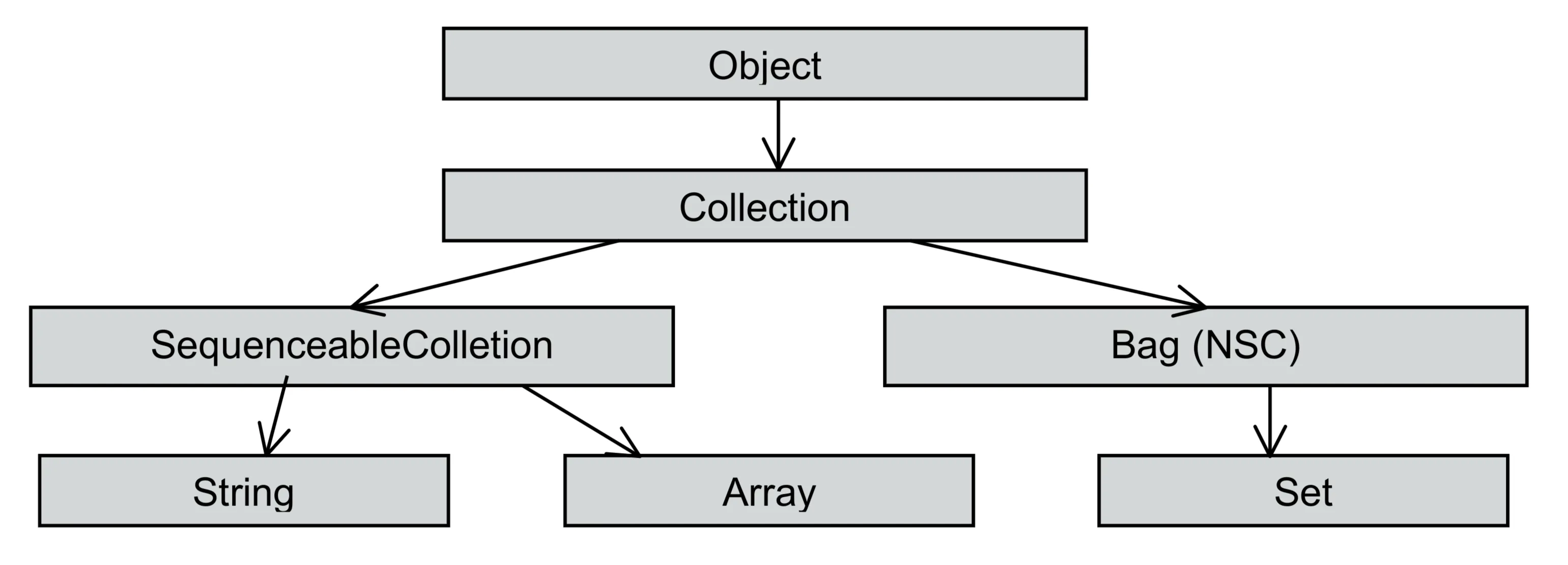 Objectis the root.Collectioninherits fromObject.SequenceableCollectionandBag (NSC)inherit fromCollection. (NSC likely stands for Non-Sequenceable Collection).StringandArrayinherit fromSequenceableCollection.Setinherits fromBag (NSC)(or conceptually represents a non-sequenceable collection without duplicates). Note: Set inheriting from Bag is unusual; often they are siblings under a common collection superclass. However, sticking to the diagram’s implication.