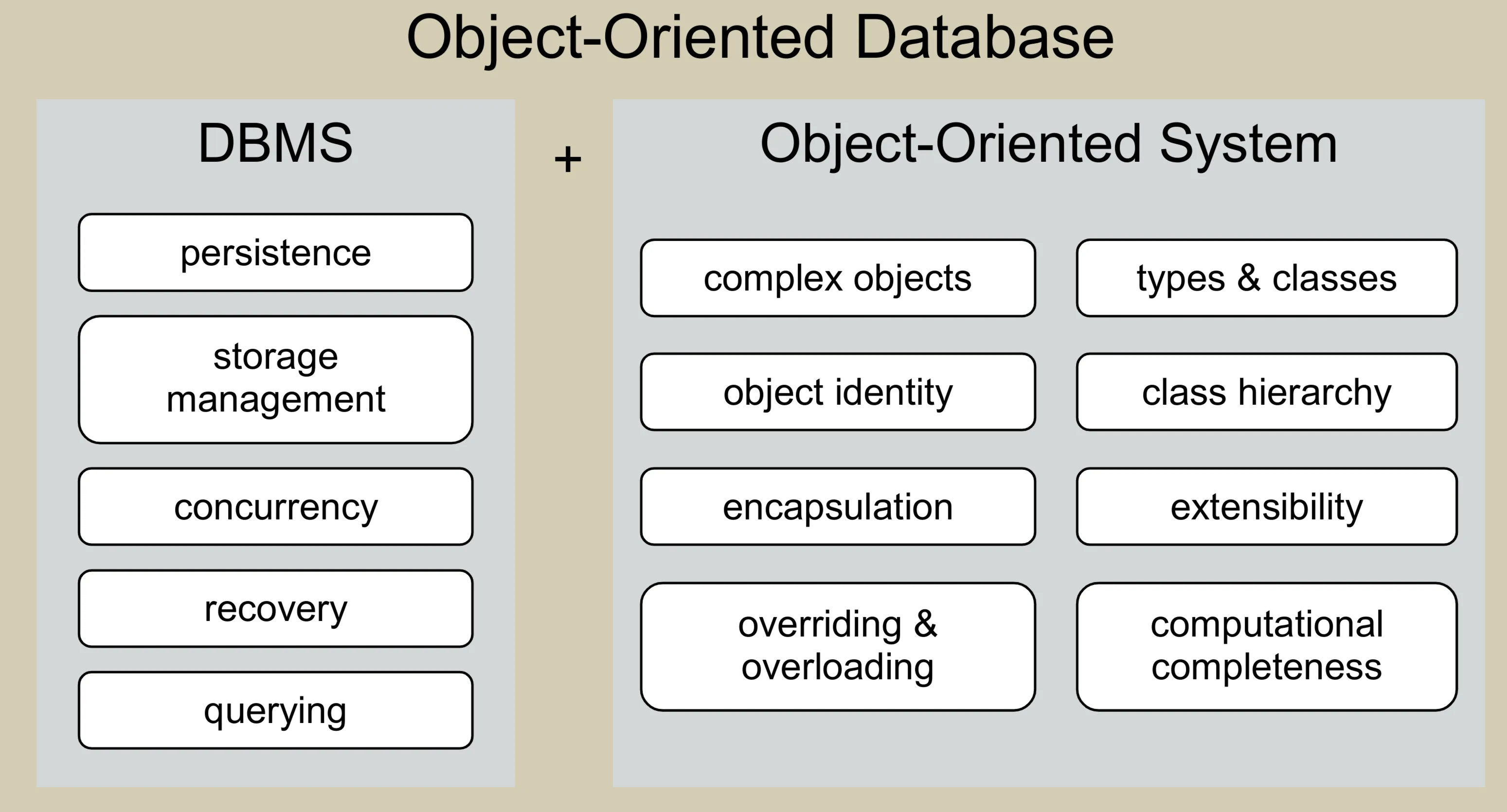 - Core Idea: An OODBMS combines features from traditional DBMS with features from object-oriented systems.