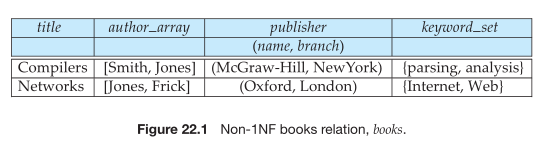 Authors: A list/array. Need to query for books by a specific author (e.g., ‘Jones’), implying interest in subparts. Domain is non-atomic.