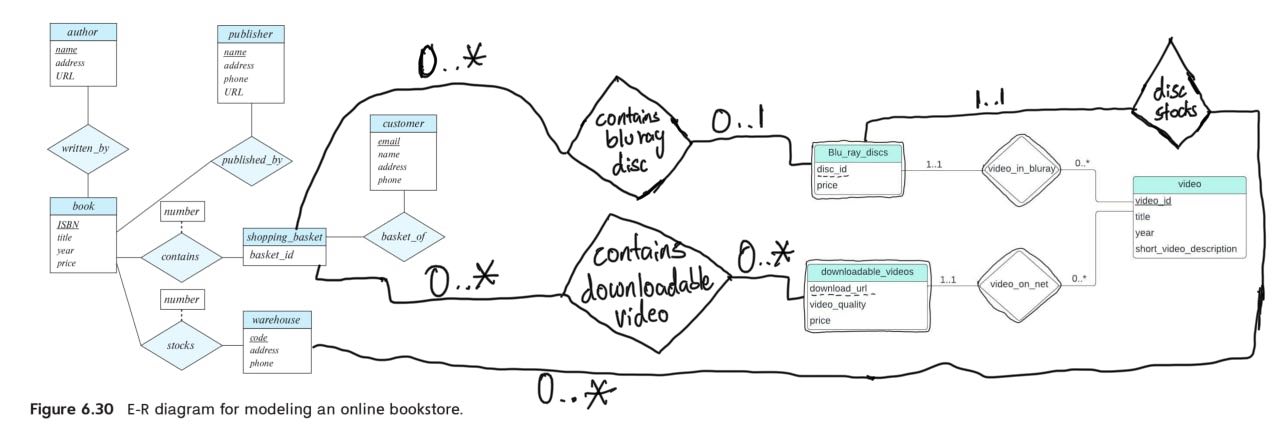 a. Suppose the bookstore adds Blu-ray discs and downloadable video to its collection. The same item may be present in one or both formats, with differing prices. Draw the part of the E-R diagram that models this addition, show just the parts related to video.