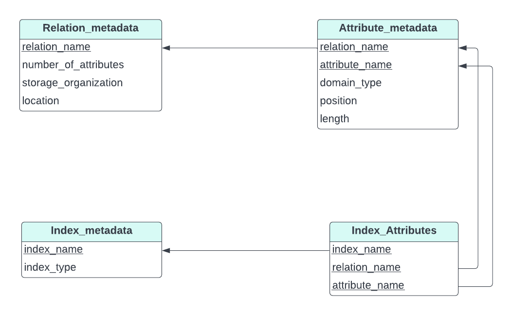 Note that the above schema is in first normal form. Normalizing it further, to BCNF will result in a more even worse schema in the eyes of performance. It is not in BCNF because of the functional dependency index_name relation_name in the table Index_Attributes.