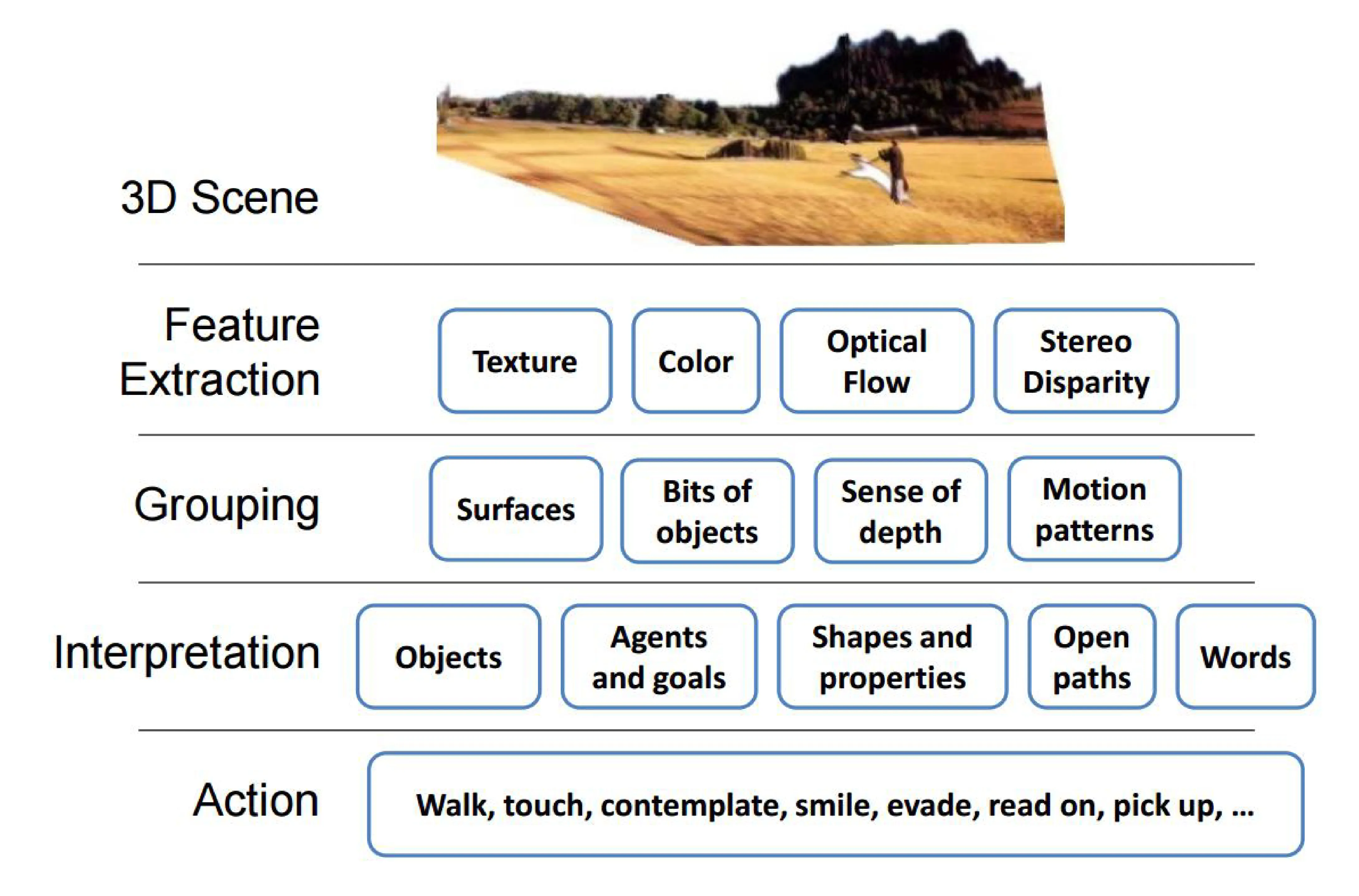 - Interpretation: Recognize objects, agents/goals, shapes/properties, open paths, understand semantics (Words).