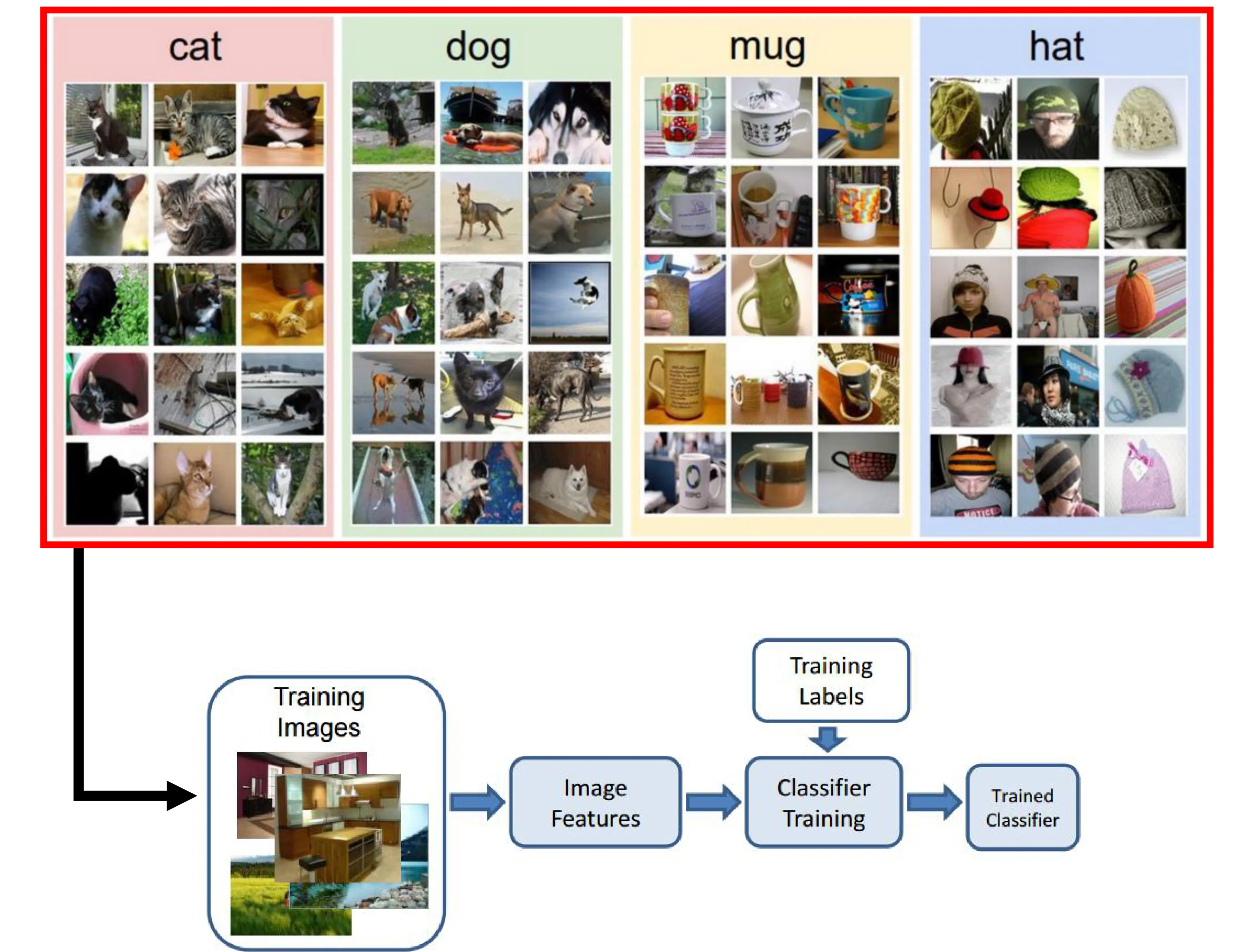 - Pipeline: Training Images → Extract Image Features → Classifier Training (using Training Labels) → Trained Classifier.