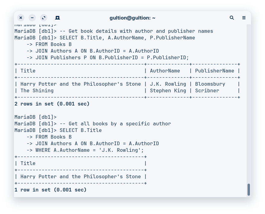 (2, '978-0451169518', 'The Shining', 2, 2, 8.99);5. Querying the Normalized Schema: