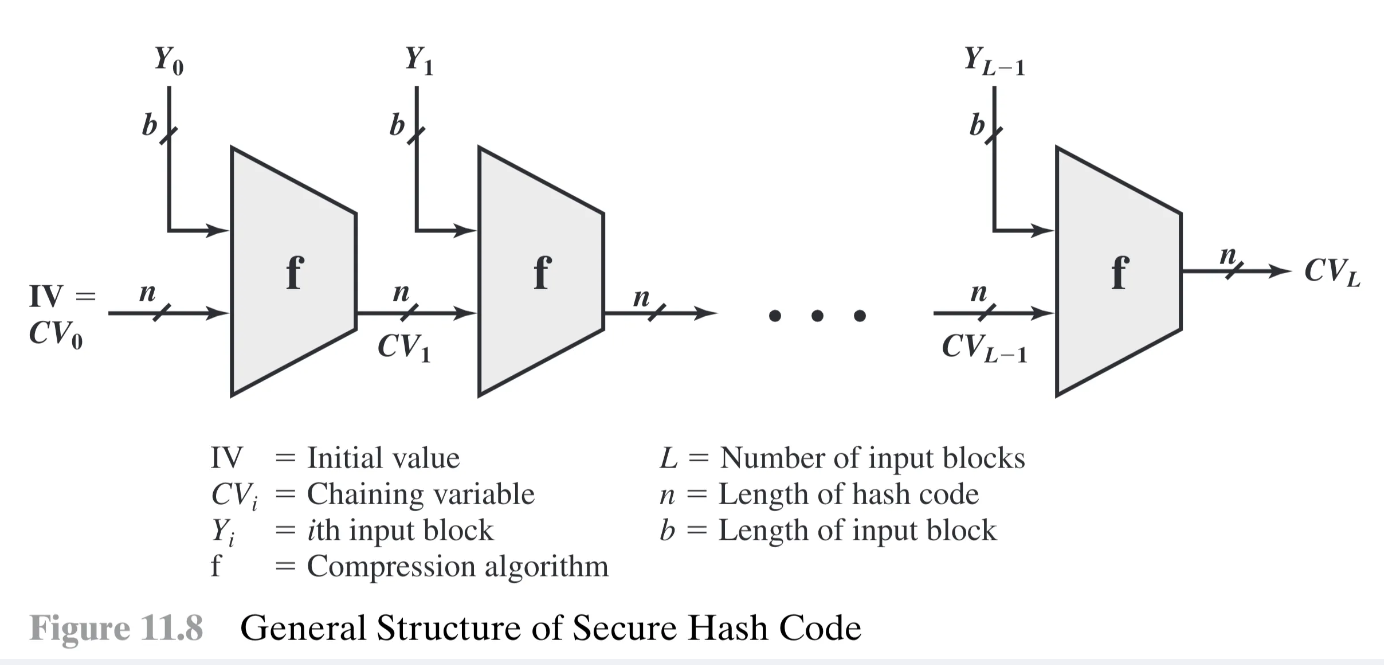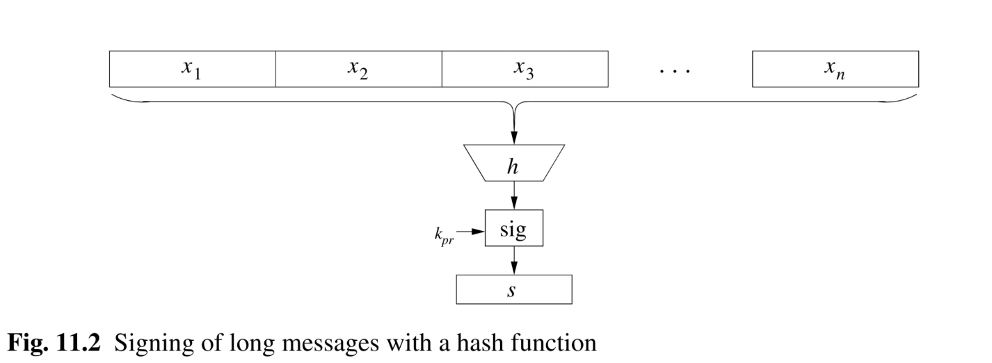 - Diagram Description (Fig 11.2 - Signing with hash function): Shows message blocks to being fed into a hash function . The single output hash value is then fed into the “sig” box with the private key to produce one signature .