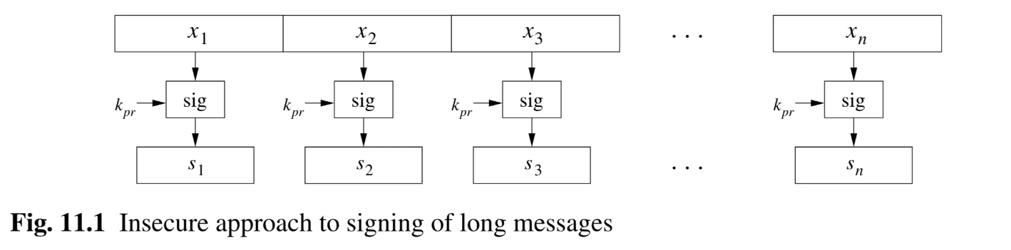 - Diagram Description (Fig 11.1 - Insecure approach): Shows message blocks to . Each block is independently fed into a “sig” box (signing algorithm) with the private key , producing individual signatures to .