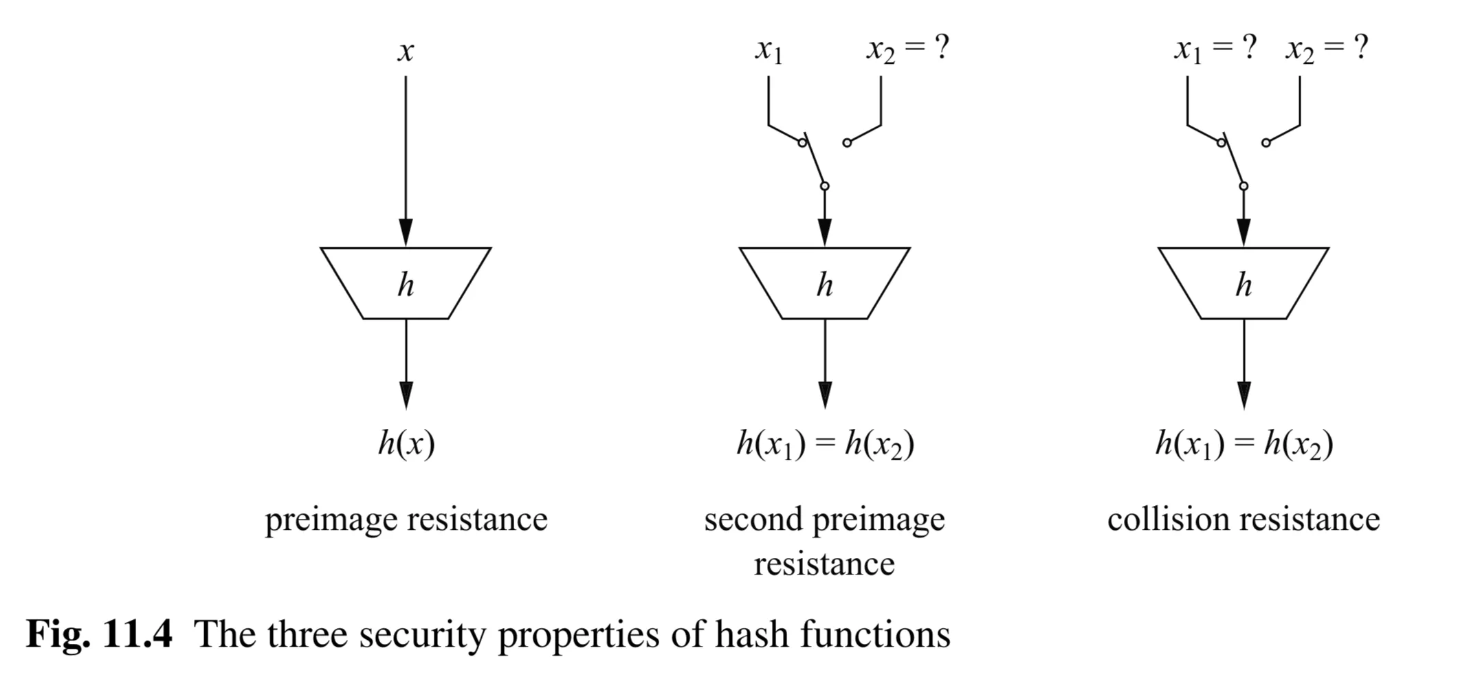 - Collision Resistance: Infeasible to find any pair such that . (Strong collision resistance).
