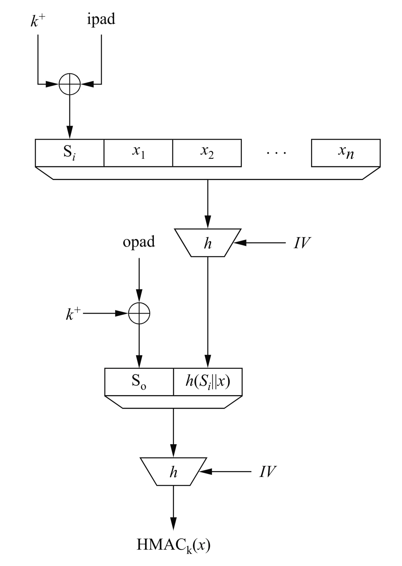 - Structure: Uses two nested hash computations (inner and outer). Let be the hash function, be the secret key, and be the message. Let be the input block size of the hash function in bits, and be the output size in bits.